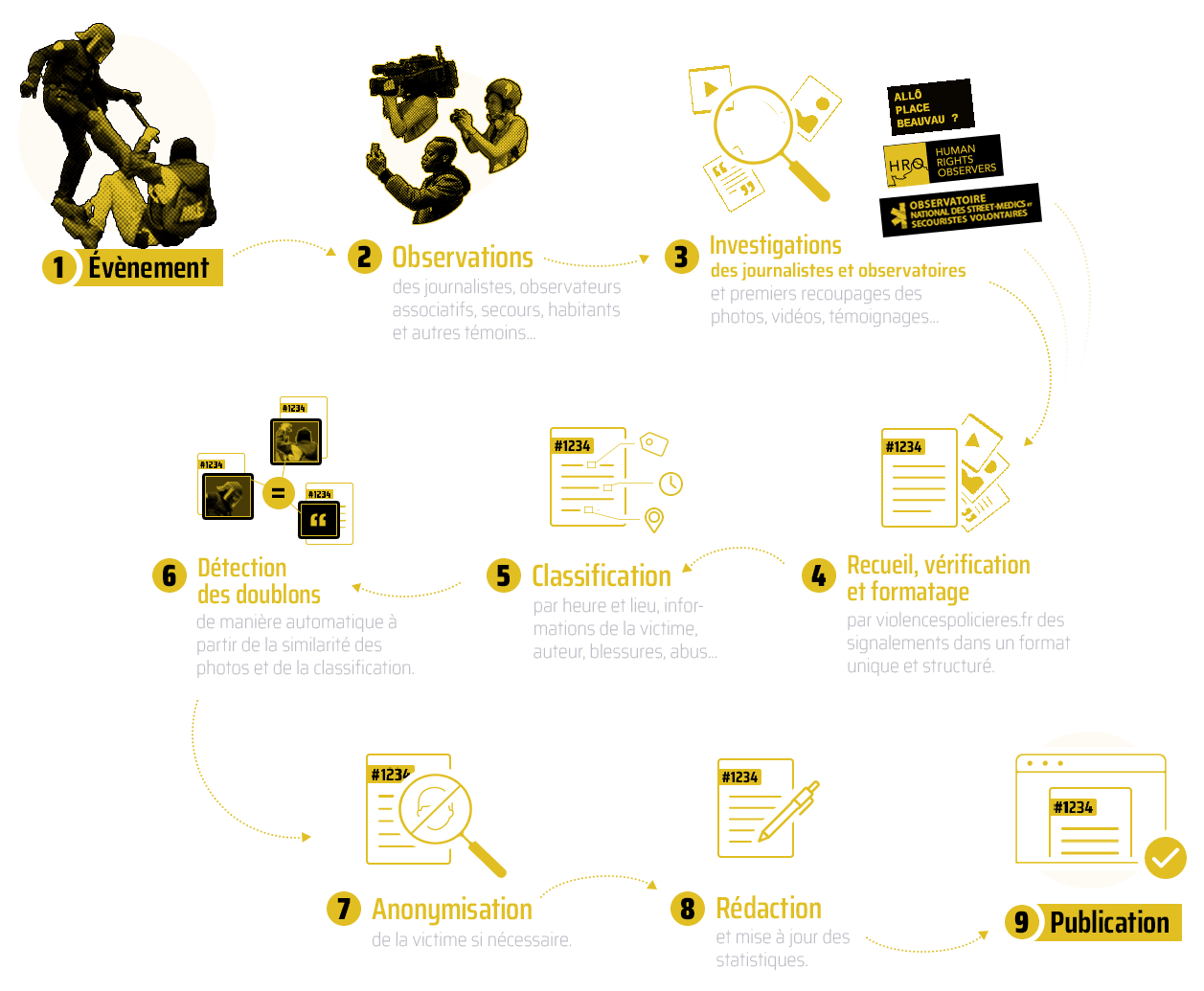 Le site rassemble sous un format unique les recensements de journalistes et observatoires des violences policières. Chaque signalement est classifié suivant de nombreux critères, comparé aux autre signalements (afin de détecter d'éventuels doublons) et anonymisé.